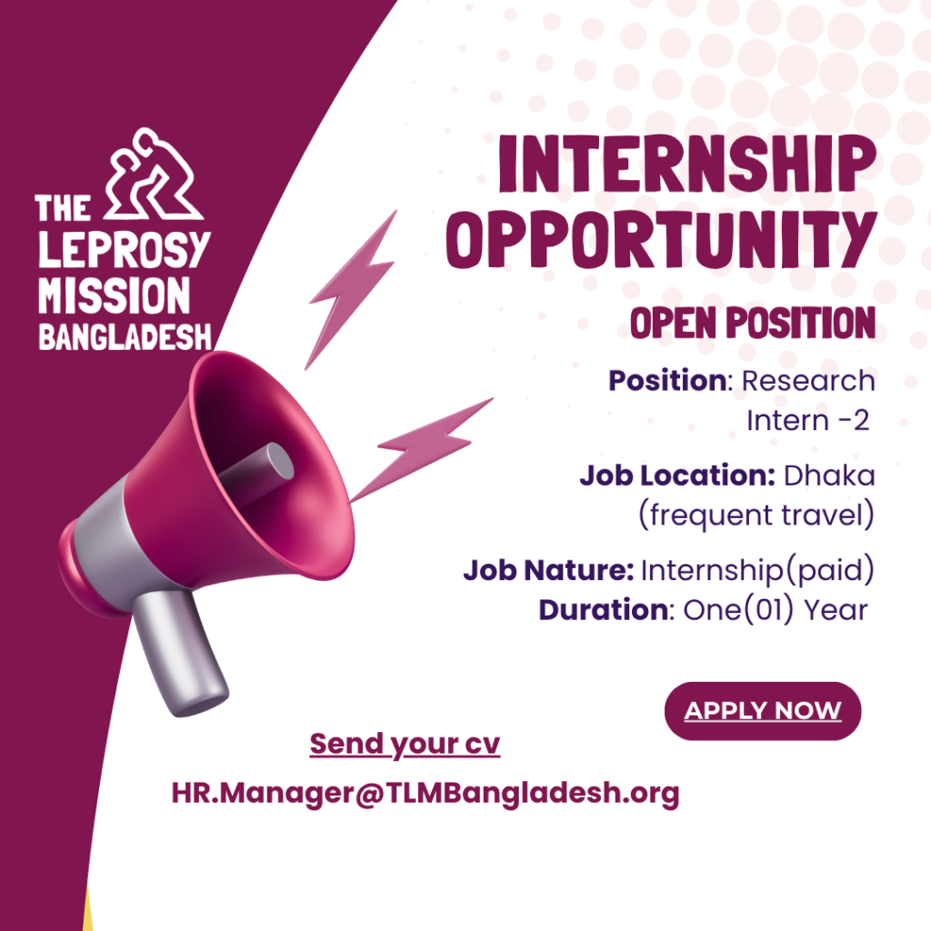 The Leprosy Mission International Bangladesh (TLMI-B) is a member of The Leprosy Mission (TLM), which is an International Christian faith-based organization committed to changing the lives of persons affected by leprosy. TLMI-B has been working in Bangladesh since 1991 as a partner of the Government of Bangladesh to eliminate the causes and consequences of leprosy to achieve its vision, ‘leprosy defeated, lives transformed’. The major areas of work include healthcare services, socio-economic rehabilitation, advocacy, and research for the people affected by leprosy, disability, and social exclusion. We are excited to announce an internship opportunity to join one of our research projects, ’Regional Variations in Social Stigma Toward Leprosy Patients in Bangladesh ’, for students interested in research, data collection, analysis, and development.